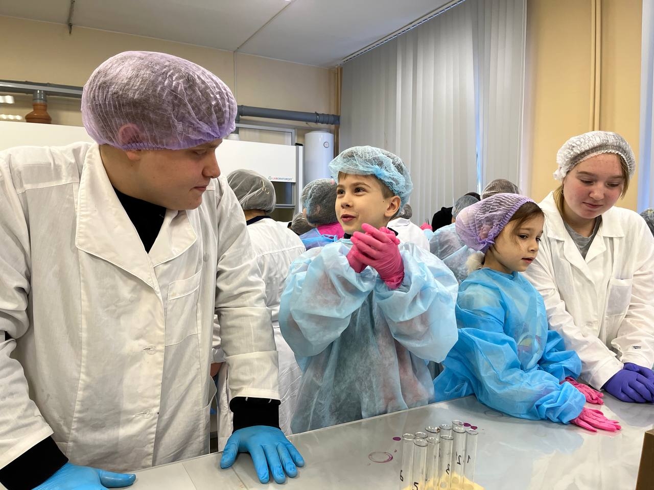 Настоящая лаборатория: Дети увидели колбы, пробирки, микроскопы и другое оборудование, которым обычно пользуются студенты. 🔬 Они могли подержать приборы в руках и почувствовать себя настоящими учеными!🧑🔬