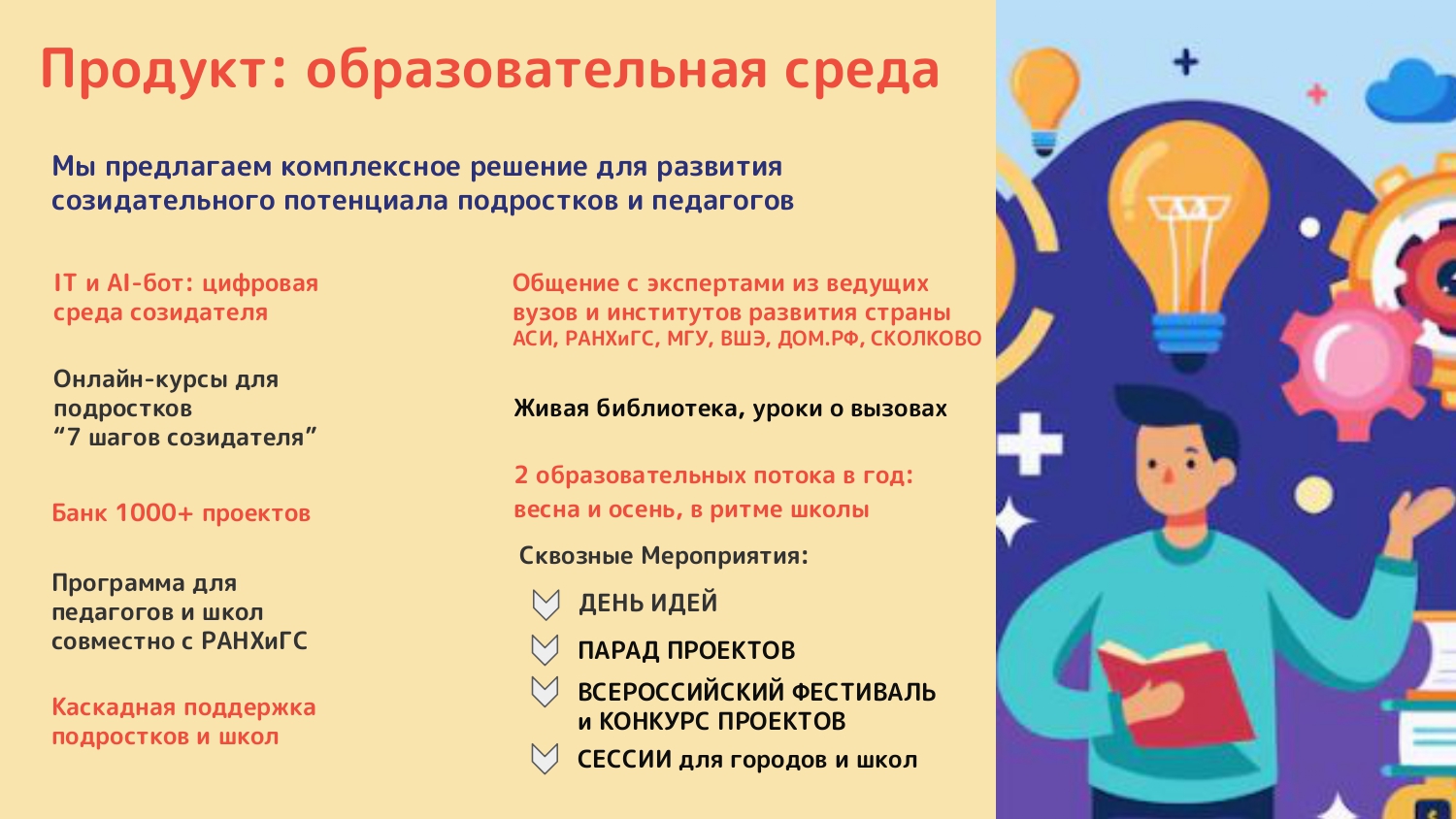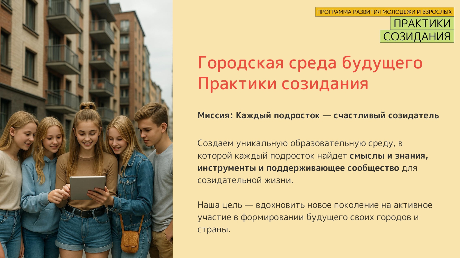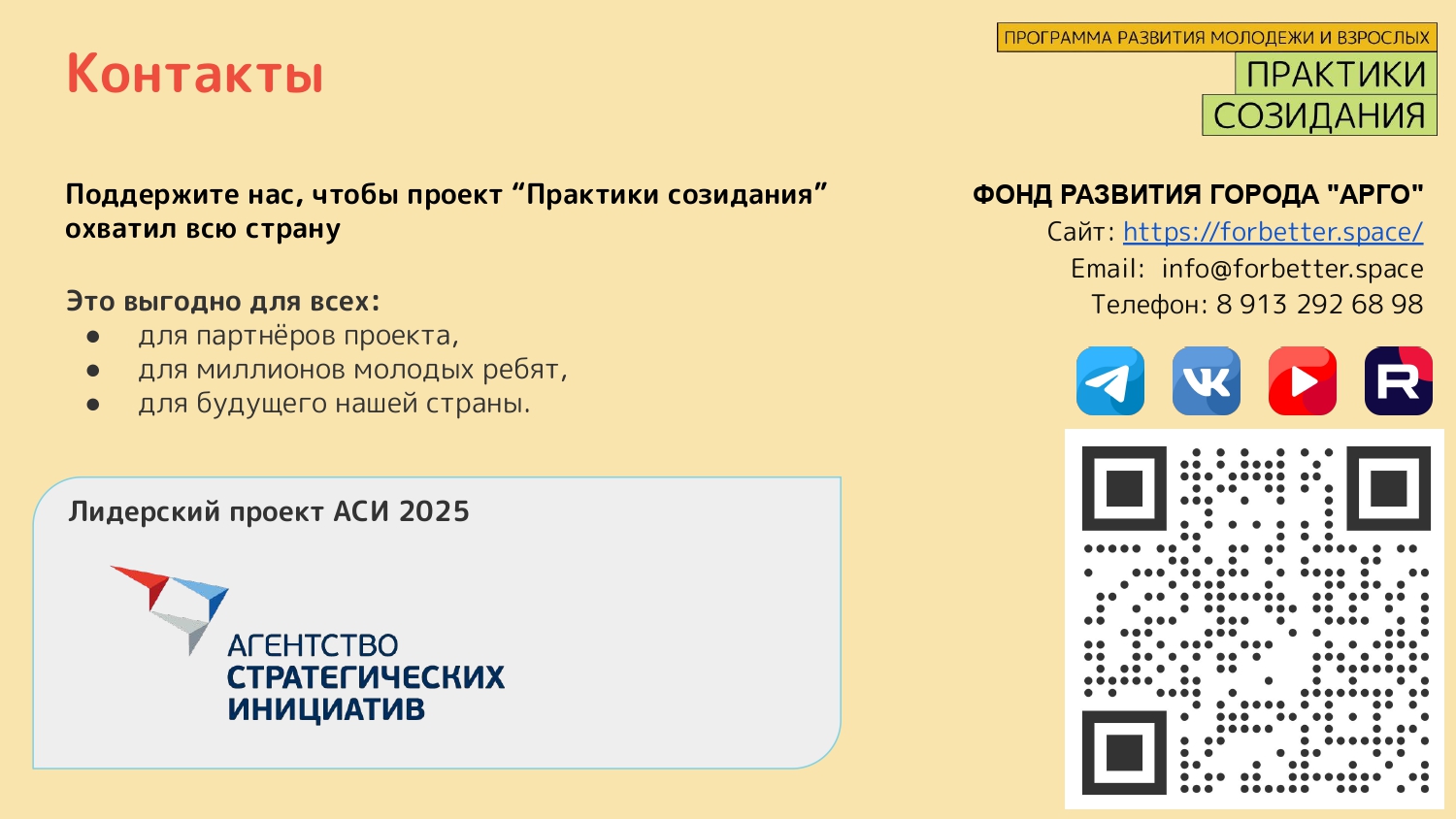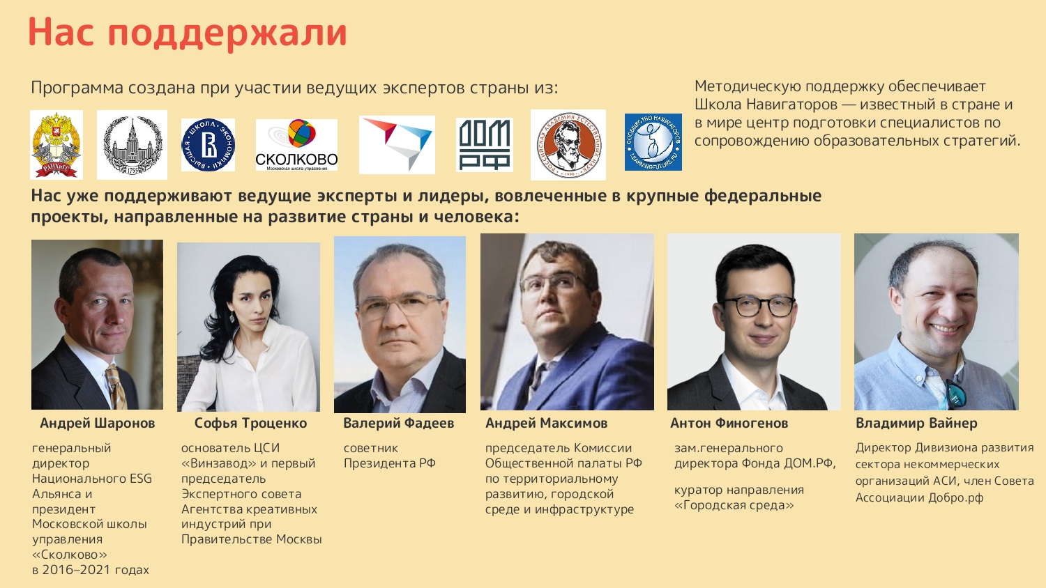 Автономная некоммерческая организация «Агентство стратегических инициатив по продвижению новых проектов» (далее — Агентство) в рамках своей деятельности оказывает поддержку проекту «Городская среда будущего. Практики созидания» (https://forbetter.space/) (далее — Программа), представляющему собой федеральную социальную программу для подростков, молодых людей (12-25 лет) и педагогов. Инициаторы программы — НКО «Фонд развития города АРГО» и сообщество «Живые города». Эксперты сообщества «Живые города» с 2014 года занимаются формированием комплексного подхода к развитию российских городов, активно участвовали в реализации важнейших федеральных проектов, таких как национальный проект «Формирование комфортной городской среды», программа комплексного развития моногородов и федеральный проект по развитию креативной экономики.