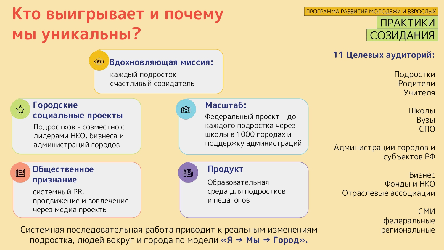 Основные приоритеты программы — создание городских и школьных социальных проектов; помощь в определении образовательной и карьерной стратегии; внедрение системы наставничества и поддержки проектного подхода в школах, подразумевающей