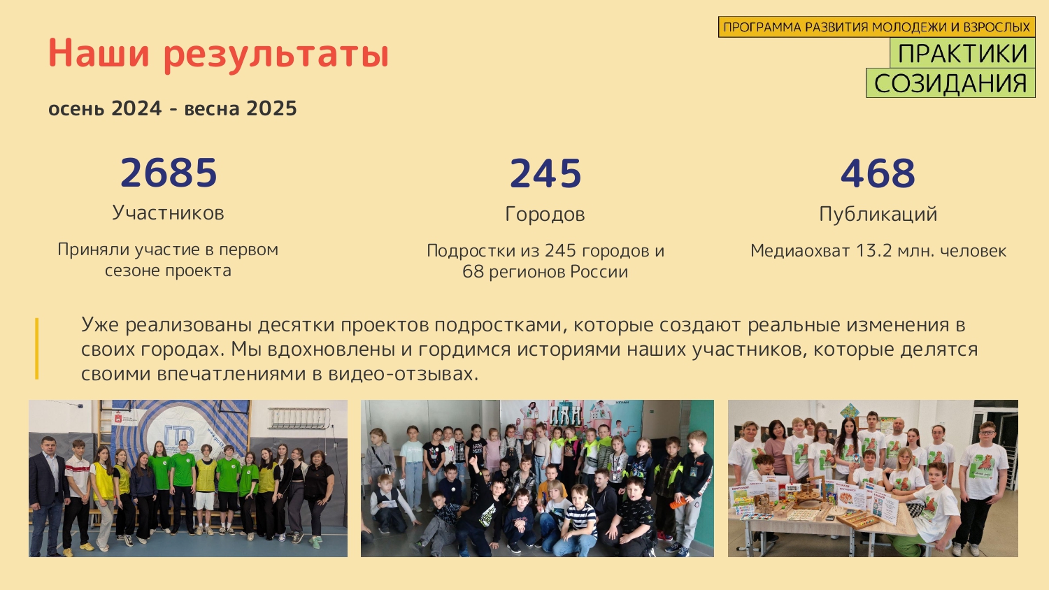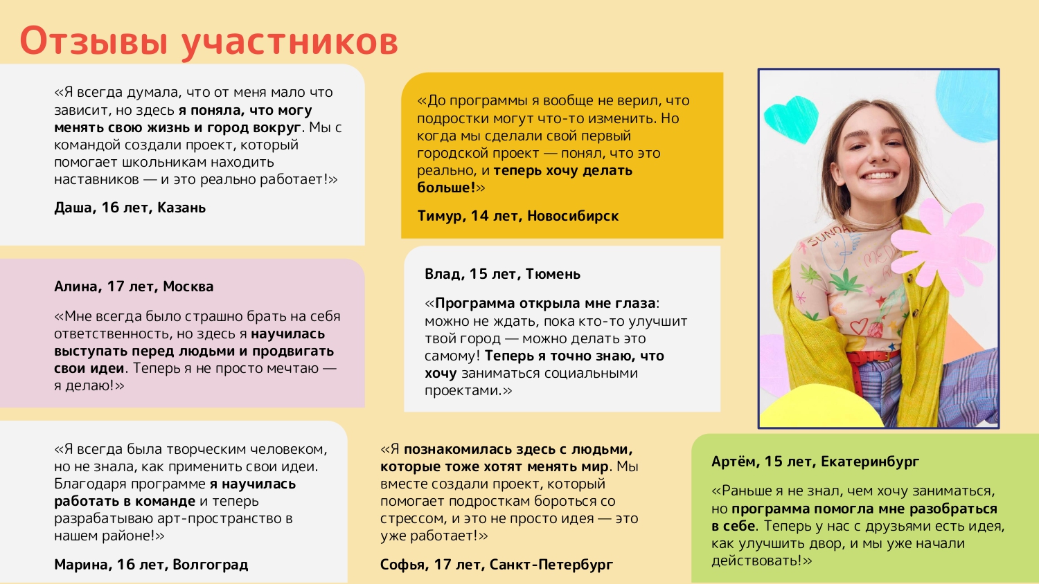 Проект уже собрал более 2000 участников из 245 городов и 68 регионов России и реализуется при поддержке Российской академии народного хозяйства и государственной службы при Президенте Российской Федерации. Школьники и студенты уже предложили в рамках проекта свои идеи по развитию городской среды и при поддержке ведущих экспертов страны приняли участие в их реализации — от обустройства дворов и парков до социальных, культурных и экологических инициатив.