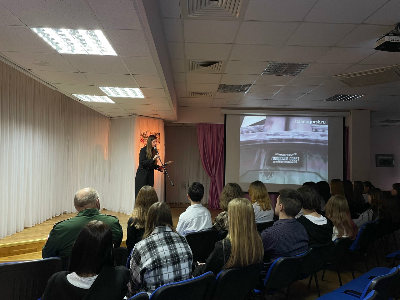 Студенты познакомились с историей боевых действий в декабре 1941 года на подступах к Сталиногорску, вспомнили об обороне и освобождении нашего города и окрестных селений 🏘 и проникновенно читали стихи 📜, посвящённые героям-землякам. Яркие страницы в летопись тех суровых дней вписали бойцы подпольной комсомольской организации, действовавшей в городе. Об их боевом пути рассказала сотрудник библиотеки Анжелика Васильевна Польшина 👩💼. Её выступление сопровождалось кадрами военной кинохроники 🎞, уникальными фотоматериалами 📸 и другими документами военных лет.